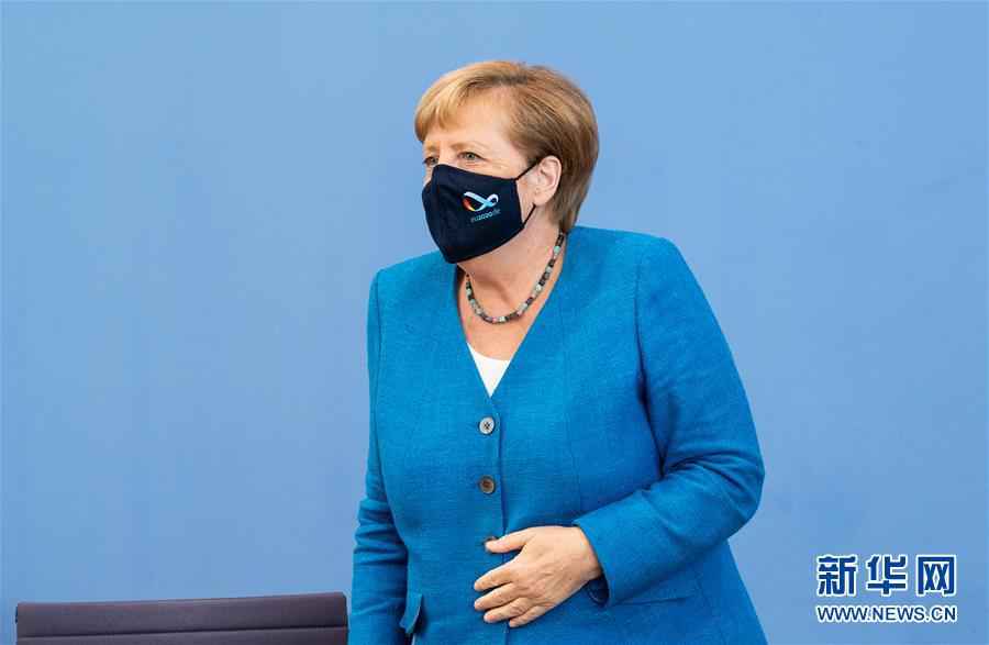 8月28日,在德国首都柏林,德国总理默克尔佩戴口罩抵达夏季记者会现场。 新华社记者 任珂 摄